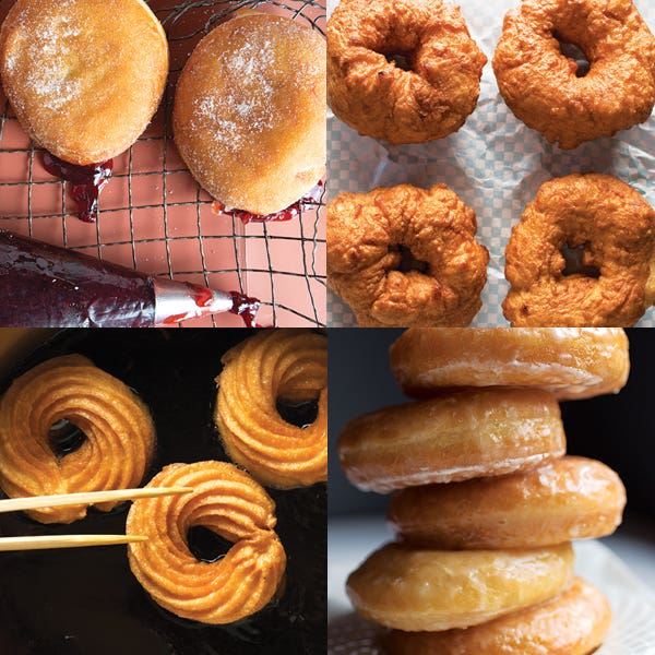When you walk into your average American donut shop, chances are you'll find a few key varieties of donut, and each has its own delectable appeal. There are yeast, or raised, donuts—think classic Krispy Kremes or pillowy jelly-filled. Made from yeast-leavened dough that rises twice before it's fried—once after it's mixed, then again after it's shaped—the resulting donut is light and fluffy enough to melt in your mouth. Then there are cake donuts, the sturdiest of the bunch; prime examples are dense chocolate donuts or substantial old-fashioneds. Made with a chemical leavener, such as baking powder, the dough doesn't need time to rise and can be fried immediately. These are the dunkers of the donut world, the ones with heft, a satisfying crust, and a moist interior. Unlike yeast donuts, they're still pretty good on day two…assuming you have the willpower to keep them around. The cruller, meanwhile, is made from eggy choux pastry, the same type used for eclairs and which is more like a batter than a dough. These extruded donuts are piped into twist or ring shapes before they're dunked into hot oil. Crisp on the outside, custardy within, and usually coated with a simple sugar glaze, the cruller is the donut at its most elegant. The most recent addition to the donut canon is the baked donut, a cupcake-like rendition of its fried cousin. Part of the allure of these moist-crumbed treats is how easy they are to make at home. Forged in the oven in muffin or ring-shaped tins, they pose no risk of spattering oil, yet the results can be pretty convincing.