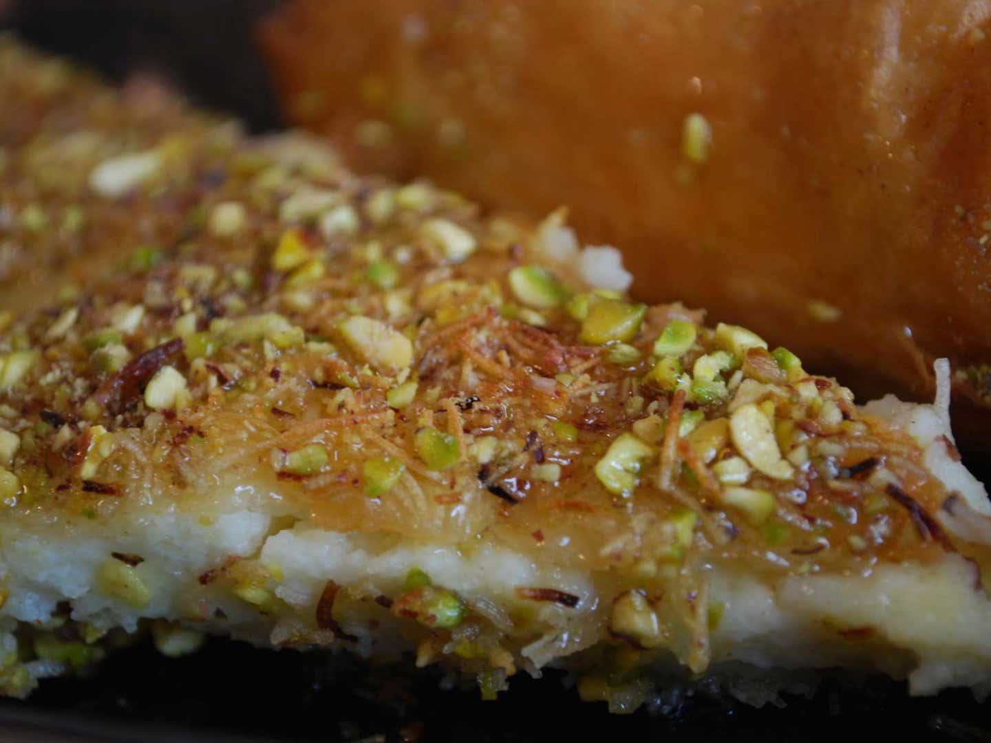Is it sweet or savory? The magic of kanafeh—a dessert popular across the Middle East—is that it's both. A base of gooey, stretchy, and slightly salty cheese is topped with generously buttered kataifi (golden shreds of phyllo), spritzed with spiced syrup, and baked until the cheese starts to ooze and the phyllo topping browns into a mass of irresistible crunch. May the pastry gods strike me down for saying so, but it's a sweet that goes toe to toe with baklava, and as far as I'm concerned, far surpasses it.