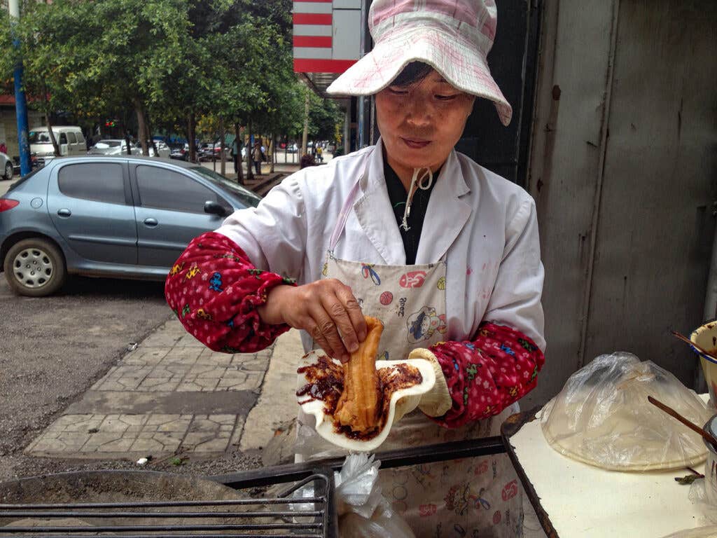 First she toasts each piece over homemade charcoal, carefully flipping them until they are hot and blistered all around. Then she slathers each with sauce—either a spicy paste made from fermented beans and chiles, or one made from a mix of ground sesame seeds and peanuts. Finally, she wraps the erkuai around a youtiao, a long piece of fried dough, and pops it into a small plastic bag. (The bag is so thin, you have to hold it by its tiny handles, as if you were carrying a doll's purse, to keep from burning your fingers.) Erkuai bao youtiao is a popular breakfast here, and a bag costs less than a dollar.