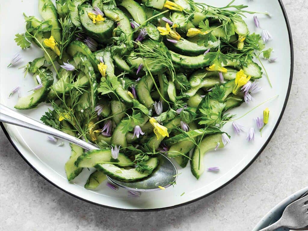 Copenhagen-based author Niclas Grønhøj Møller salts cucumbers, seasons them with a squeeze of lemon, and finishes with edible flowers to make this refreshing Danish salad. Get the recipe >