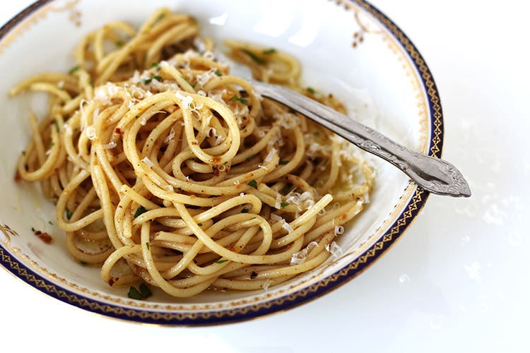 The pasta for this potent and luxurious dish is cooked in chile-spiked chicken stock and bolstered by three preparations of garlic: roasted, fried, and sauteed.