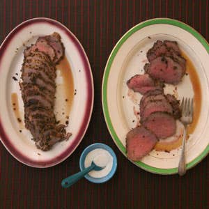 My family's Christmas traditions have evolved over the years, but the centerpiece of our Christmas Eve dinner menu has always been the same: an entire roasted beef tenderloin. Not only is it tender and flavorful, but cooking it whole, rather than in separate filet steaks, is quick and easy. It's also an ideal dish for picky eaters because different sections of the tapered cut cook at different rates. At our holiday table, the red-to-pink continuum goes something like this: my grandfather and my aunt get slices of bloodred, rare meat from the thicker, butt end of the roast; the medium-rare slices from the center section are portioned out to me and my cousins; and my mom claims the slices from the narrower, tail end, which cooks to a perfect medium. For years, my grandmother and my aunt took on tenderloin duty, rubbing the beef with salt and pepper and roasting it in a low oven. They recently passed the baton to me, and in the years since, I've taken a few liberties, adding an herb-and-peppercorn crust to the tenderloin and cranking up the oven's temperature in order to achieve a crisp exterior. My adaptations have been well received, for the most part. Last year, my 92-year-old grandfather grumbled, "Are you putting on that damn crust again?" Still, I couldn't help noticing that he took a second helping.