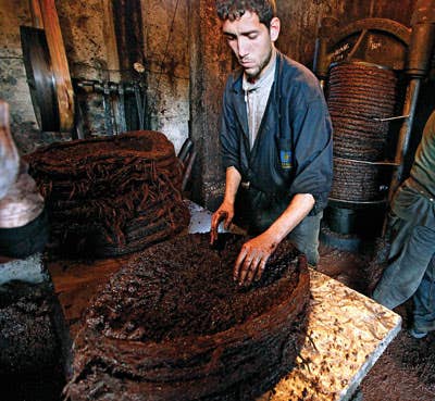 The processing of olives to make oil follows age-old methods. The best olive oil is usually pressed from fruit that is just beginning to turn from green to reddish brown, a stage that Italians call invaiatura, literally "darkening." Oil from olives at this stage has a pleasing pungency and bitterness, an indication of the presence of polyphenols, natural compounds that help protect the oil from rancidity and give it a complex flavor. Today, growers around the world schedule their harvest so that olives can be pressed quickly, ideally within 24 to 48 hours of being picked. The most common pressing method uses continuous-cycle machinery: olives are dumped into steel chambers, crushed into paste by metal hammers or disks, forced through a kneader that begins to extract the oil, and sent to a centrifuge to separate out solids and water. Some mills, like the one featured above in Bejaia, Algeria, still do things the old-fashioned way: crushing olives in a basin with giant stone wheels and then spreading the paste out on woven grass or nylon mats. The mats are stacked atop one another and compressed in a hydraulic press that slowly extracts the liquid, which drips into a tank below; the oil, which rises above any water, is ladled off the top. Though picturesque, the old pressing method has a downside: it exposes the olive paste to the open air for hours, causing oxidation and raising the potential for rancidity.