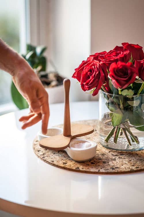 • My favorite tools are my Japanese mandolin and my cast iron skillets. I like making lots of shaved vegetable salads with my mandolin, and I like putting my skillet in the broiler and getting it really hot and cooking things quickly that way so the place doesn't stink up. Most of the equipment in the kitchen we brought with us from Australia, but in hindsight we would have brought a lot more, because we had a lot of nice stuff we left behind. One of my favorite little things we brought with us is is a salt-and-pepper boat from Australian designer Marc Pascal.