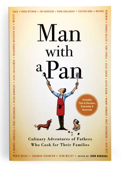 These days, Dad rarely cooks, but his efforts two decades ago put him ahead of the curve: Today, with nearly 70 percent of mothers working, more men than ever are cooking—and not grudgingly, but willingly, enthusiastically, even obsessively. That's the gist of Man With a Pan (Algonquin Books, $15.95), an anthology of, as the subtitle puts it, "Culinary Adventures of Fathers Who Cook for Their Families." Edited by John Donohue, a cartoonist and editor at The New Yorker, the book features renowned writers such as Mark Bittman and Stephen King, celebrities (chef Mario Batali, screenwriter Matt Greenberg), and interviews with regular fathers who happen to cook.