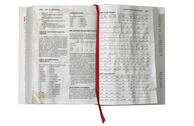 The tattered red ribbon bookmark is always tucked between these pages of my old copy of Joy of Cooking, seventh edition. That's where you'll find the Tables of Equivalents and Conversions, and they may just be the most useful two pages of culinary information ever put into print. The more I cook, the more I rely on them: for doubling recipes, converting metric measurements, switching from dry ingredients to wet ones—for almost anything that requires me to adapt, improvise, and invent in the kitchen. —Steven Horn, Beverly Hills, Michigan
