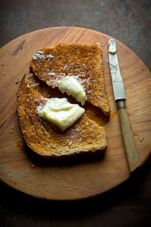 "Food is the only source of human power to work or to think," Farmer writes. With that, I took strength from her suggested menu for a patient suffering from dilated stomach and prepared a meal of water toast. (This is not to be confused with toast water, another popular recipe of the time used to treat nausea.) Water toast involves dropping slices of dry toast in boiling salted water, quickly removing them, and then smothering them in butter.