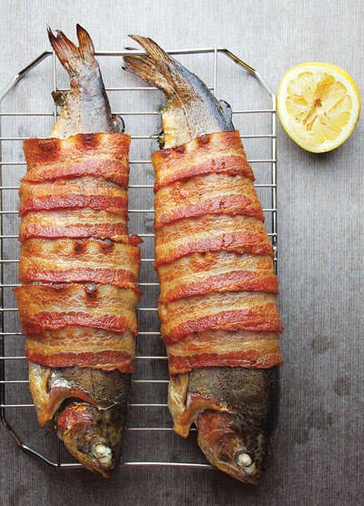 - Heat oven to 375°. Place bacon on a rimmed baking sheet, and bake until half-cooked, about 10 minutes. Remove from oven, and let cool. Brush inside and outside of each trout with 1 tbsp. oil, season with salt and pepper, and stuff with 3 sprigs tarragon each; set aside. Arrange 6 bacon slices, overlapping slightly, on a cutting board parallel to you. Place I trout over middle of bacon perpendicular to you, and wrap trout in bacon, arranging it seam side down on the rack of a stove-top smoker. Repeat with remaining bacon and trout.