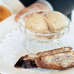 - Meanwhile, grease a medium sheet pan with butter and set aside. Put remaining sugar and 4 tbsp. warm water into a small heavy pot and simmer over medium-low heat, swirling pot over heat frequently, until sugar caramelizes, about 25 minutes. Immediately pour syrup onto prepared sheet pan and tilt pan around, spreading syrup out to a thin layer. Set aside to let cool. Crack caramel into small pieces and stir into cooled custard . Process in an ice cream maker according to a manufacturer's directions. Serve with carquinyolis, if you like.