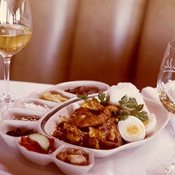 The menu at Trader Vic's in Beverly Hills used to offer both Calcutta and "Susu" curries—the latter milder and creamier—made with chicken, beef, lamb, or shrimp. They came with an assortment of often unlikely condiments, as below; adding those to the dish enlivens it considerably.