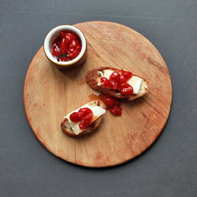 This jammy tomato compote is perfect paired with a triple cream goat cheese or with firm white-fleshed fish dishes. Floral vanilla bean brings out the musky qualities of cherry tomatoes. It is best made with ripe tomatoes at the height of summer. Read more about this recipe in "Preserving Tomatoes: Sunshine in a Jar."