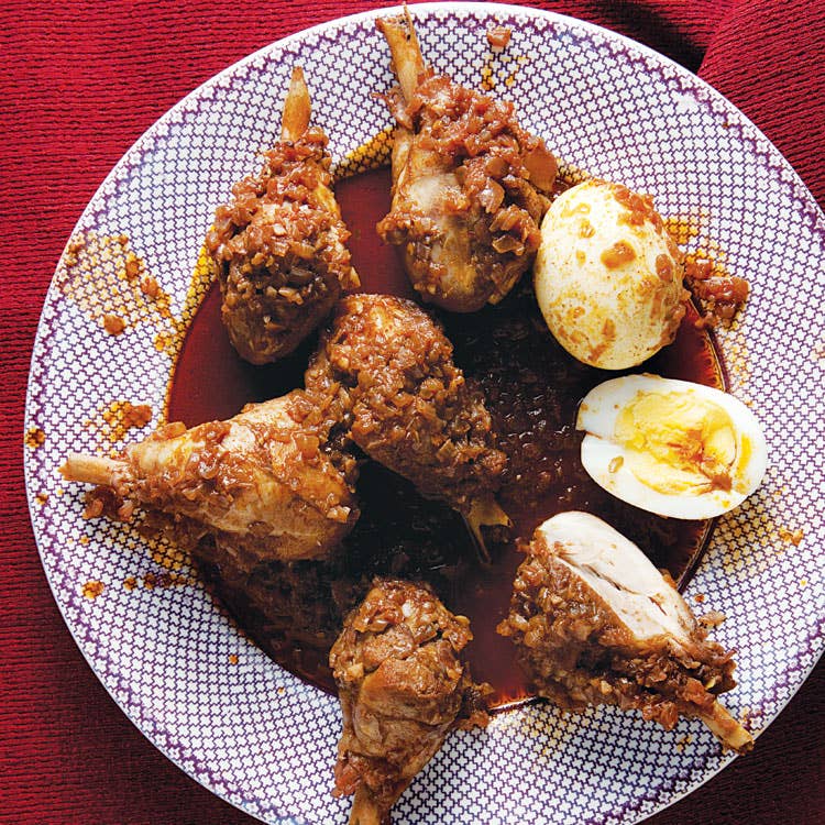I was taught to cook doro wat, the long-cooking Ethiopian braised chicken dish, by a friend in Addis Ababa. First, we sweated onions in nit'r qibe (spiced butter) for nearly an hour. Then we added the chicken thighs and legs, the fantastic Berbere spices (a vibrant blend including chile, garlic, and ginger), and white meat to the pot, and waited some more. The stock went in last, and while that simmered, we boiled and peeled eggs, adding them just before serving. Now, when my wife's sisters come to town, the first thing we do together is prepare doro wat, and that's probably my favorite occasion on which to make this dish. It gives us plenty of time to catch up.