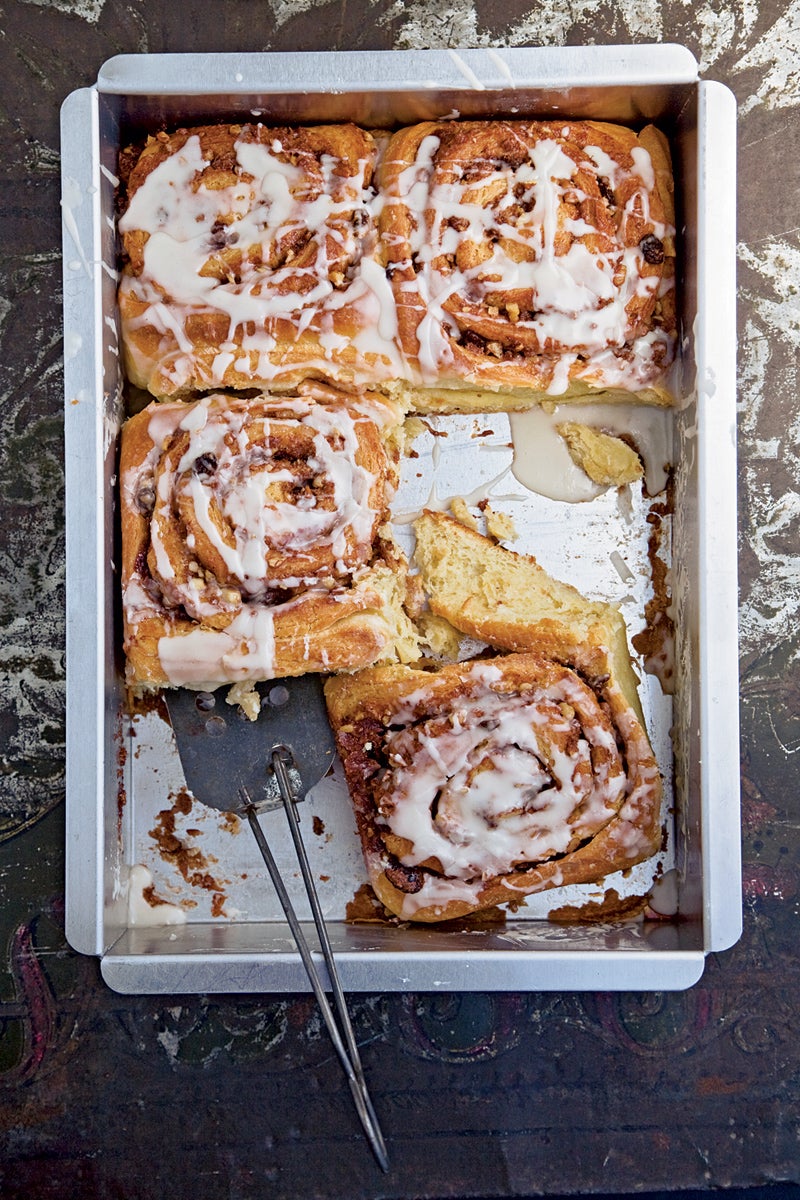 - urn the dough so that the short sides are parallel to you. Brush the top of the dough with half of the melted butter. Drizzle the reserved filling over the dough, leaving a 1″ border at the edge farthest away from you. Lightly press the filling into the dough. Using your hands, lift up the bottom edge of the dough and roll it forward into a tight cylinder. Place dough cylinder, seam side down, on a cutting board and, using a thin, sharp knife, trim off the ends; cut cylinder crosswise into 8 equal-size slices. Nestle the slices, cut sides up and evenly spaced from one another, into a buttered 9″ x 13″ light-colored metal baking pan. Cover pan with plastic wrap and set aside in a warm place to let rise for 2 hours. (Alternatively, the rolls may be refrigerated overnight.)