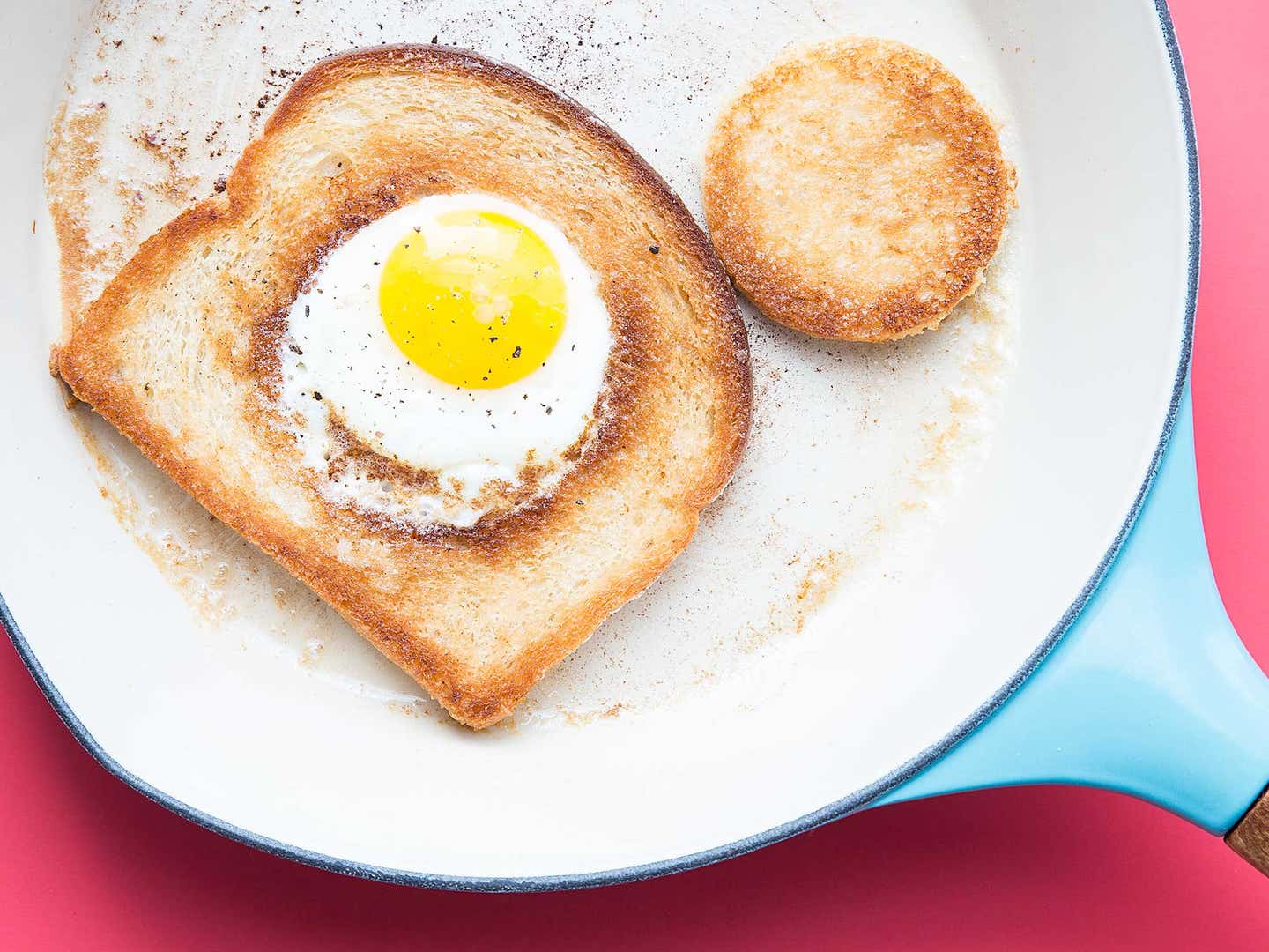 - Begin by using an inverted, sturdy glass 2"-3" in diameter to cut a hole out of the center of the slice of bread. Set bread slice and round cutout aside. Melt butter in a medium skillet over medium heat. Pan-toast bread and cutout on 1 side in skillet until golden, 2-3 minutes.