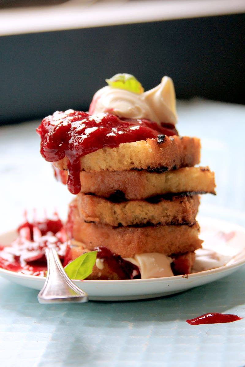 - Heat a charcoal grill or set a gas grill to medium (Alternately, heat a cast-iron grill pan over medium-high heat). Brush both sides of pound cake slices with melted butter. Grill, flipping once, until toasted, about 1-2 minutes. Divide cake between serving plates and top with plum compote. Garnish with a dollop of mascarpone and a small basil leaf, if you like.