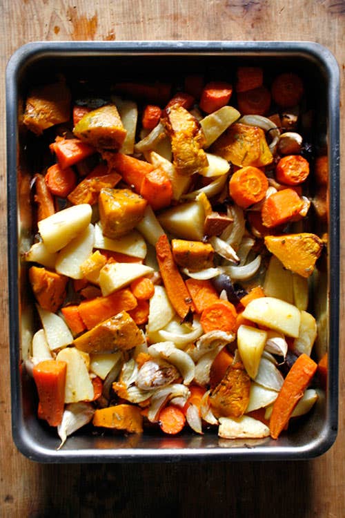 - Heat oven to 425°. Combine whole garlic cloves, potatoes, carrots, fennel, squash, sweet potatoes, onion, and lemon in a large bowl. Whisk together garlic paste, oil, thyme, rosemary, and ginger in a small bowl; pour over vegetables, season liberally with salt and pepper, and toss until evenly coated. Divide vegetables between 2 rimmed baking sheets, and bake, rotating baking sheets from the front of the oven to the back of the oven and from the top rack to the bottom rack, making sure to stir vegetables halfway through cooking, until golden brown and tender, about 1 hour and 20 minutes.