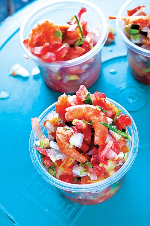 - In a large bowl, combine tomatoes, shrimp, jalapeños plus brine, cilantro, onion, and juice. Season with salt, and let sit at room temperature to meld flavors, at least 1 hour.