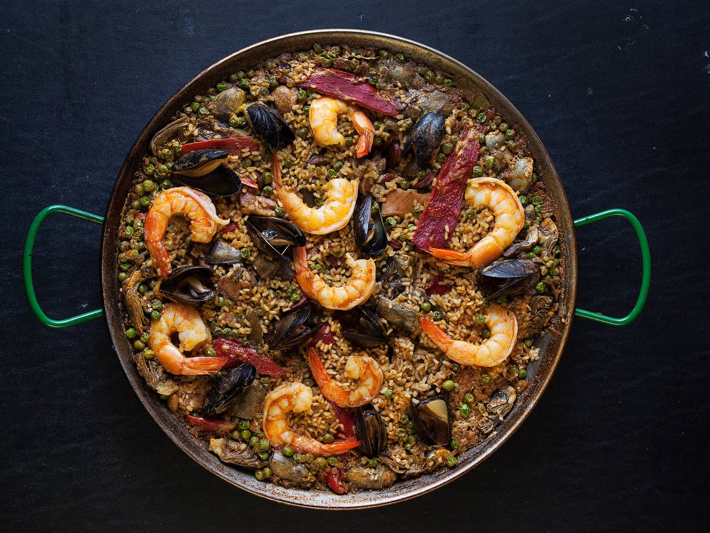This over-the-top Americanized paella gets its smoky kick from paprika and chorizo. Why "Americanized"? Traditional paella valenciana, as documented by David Rosengarten in "The Art of Paella", usually contains rabbit, snails, and chicken.