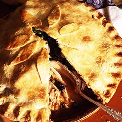- Meanwhile, roll out dough on a lightly floured surface into 2 12" rounds. Fit 1 round into a 9" deep-dish pie plate. Prick bottom with a fork, then layer pheasant, morels, potatoes, onions, and peas into the pie. Add sauce, then cover with remaining pastry round. Crimp edges, and cut a hole for steam to escape. Brush top with beaten egg. Bake for 1 hour. Remove from oven and set aside for 15 minutes before serving.