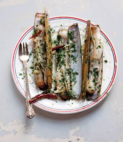 Razor clams take well to quick-cooked preparations like this one, a popular order at Bar Pinotxo, a tapas counter in La Boqueria, Barcelona's covered market.