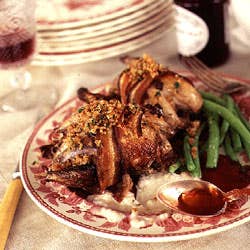 Meanwhile, to finish bread sauce, strain milk mixture into a saucepan. Warm over medium-low heat, then whisk in cream. Add bread crumbs (not Game Crumbs!) and generously season with pepper. Top each grouse with Game Crumbs and serve with Bread Sauce, currant jelly, and, if desired, steamed green beans.