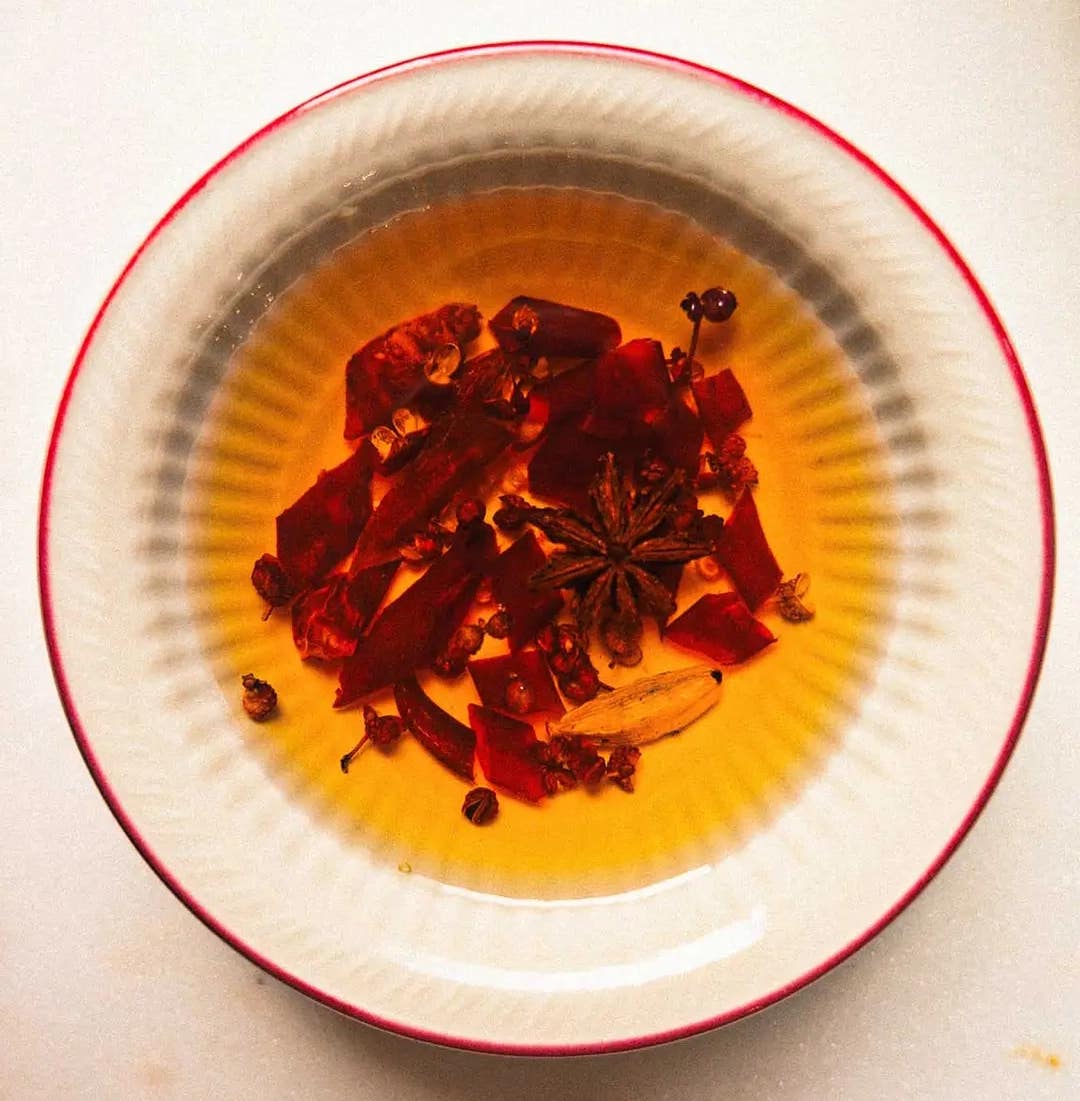 - Heat oil, star anise, garlic, cardamom, cloves, bay, cinnamon, and ginger in a 2-qt. saucepan over medium heat; cook, stirring occasionally, until garlic is golden, 15-20 minutes. Transfer to a 1-qt. glass jar with chiles, peppercorns, soy, and salt; let cool to room temperature. Using a slotted spoon, remove and discard garlic and ginger; seal jar and let sit at least 24 hours. To use, strain oil, discarding solids. Store refrigerated up to 3 months.