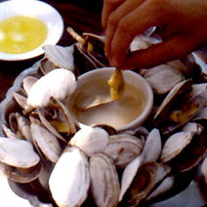 - Meanwhile, melt butter in a pan over low heat. Pour clear butter into 2 small bowls, discarding milky sediment. Transfer clams to a serving bowl and pour clam broth into 2 small bowls. To eat, pull clam out of shell by its siphon, swish in broth to remove any sand, then dip in butter. Drink remaining broth, avoiding sandy sediment.