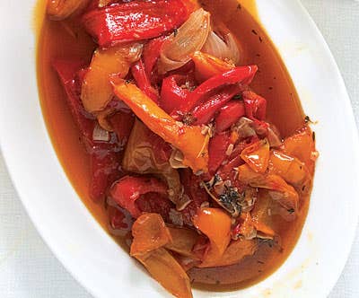 This sweet, simple pepper stew is an ideal use for summer's bounty of sweet peppers. It makes a great antipasto atop bruschetta.