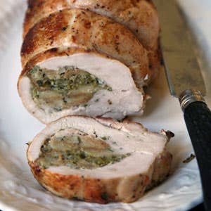 Mound stuffing along center of breast, from short end to short end. Fold one long end of the breast over stuffing; roll forward to make a tight cylinder; tuck in ends. Tie breast with kitchen twine at 1" intervals to secure.