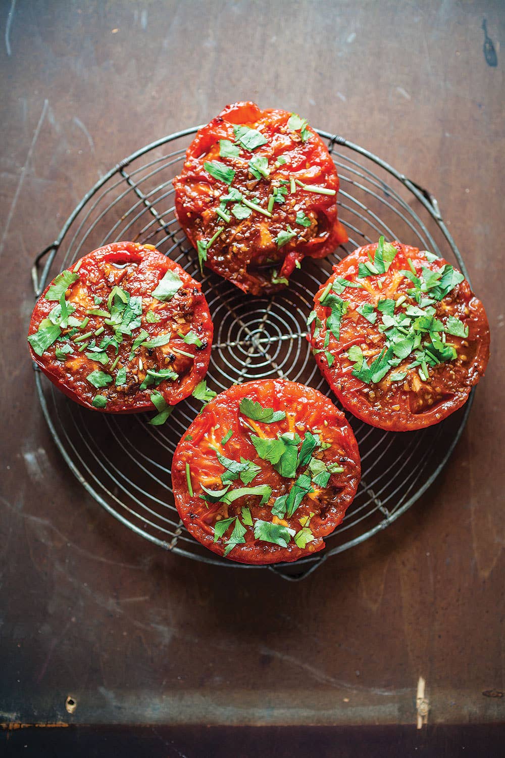 Ripe tomatoes develop umami-rich flavor when grilled with a soy sauce marinade. Mitsuba, a Japanese relative of parsley, lends a mild cilantro-like freshness. This recipe first appeared in our June/July 2013 issue along with Tadashi Ono's article The Japanese Grill.
