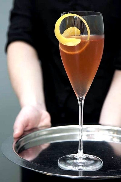 - Shake the gin, Pineau, lemon juice, simple and Punt E Mes with ice and strain into a Champagne flute. Top with the Champagne and garnish with the lemon twist.