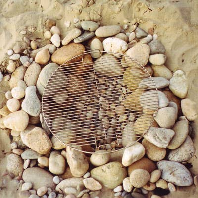 Dig a shallow, bowl-shaped hole in the sand about 2 feet in diameter. Dampen the bowl with sea water (here's where your bucket can come in handy) and smooth the edges. Line the basin completely with stones found on the beach; top with larger stones to craft a rim for your grill grate to sturdily sit atop. Arrange smaller stones and shells around the outside of the grill to clearly mark the area around the grill, and to help keep sand from getting close to your food. Pile coals or found driftwood into the stone-lined basin and light with a match. Place the grill on top, wait for the heat to reach the right temperature, and get cooking!