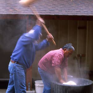 After Alice's inaugural swing of the kine, she passed it to Fred, who brought the mallet down on the sticky rice with a confident thud—and then we all took turns pounding the rice, slowly transforming it into a luminous round. Between each drop of the mallet, Tom would dart in, fold the rice over, and punch it to mark the site of the next pound so that the rice would be evenly mashed; then he'd pull back, his head just avoiding the descending mallet. The thump of the mallet and Tom's punching, which he did for hour after hour, formed a rhythm that became the heartbeat of the entire day.