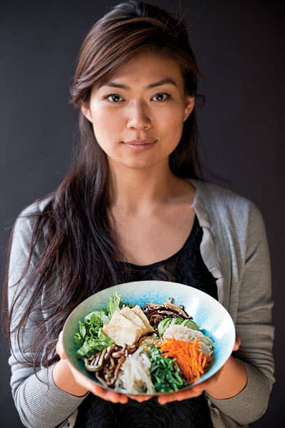 Finally, Jennifer spooned some steamed sushi rice into a bowl, drizzled sesame oil over the top, and placed a fried egg in the middle. Then she arranged the fresh vegetables and sauteed namul in a circle on top of the egg white, leaving only the sunny yolk visible in the center and alternating the ingredients according to color. "The goal, as in any Korean dish, is to incorporate five colors— red, yellow, black, white, and green," Jennifer said, "as well as five flavors: hot, sour, salty sweet, and bitter." She finished by sprinkling sesame seeds and sliced scallions on the yolk. Then we mixed in the sauce and gleefully demolished her creation. "In most Korean homes, you wouldn't have to do all this cooking from scratch to make a bibimbap," Jennifer said. "You'd have prepared vegetables on hand in the fridge, ready to put together in whatever combination you feel like making that day." Simple. And exactly the way I want to eat all summer long.