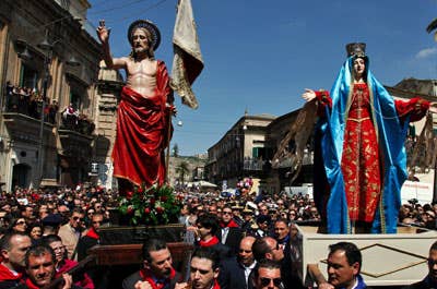 These processions, which reenact the story of Easter, set the mood for the holiday. On Holy Thursday in Trapani, I stumbled across a parade of people following a gilded, grief-stricken statue of Mary. Children's faces were hidden under black veils and the band played Sicilian funeral marches. It took more than a dozen men, their arms interlocked and faces contorted with effort, to carry that statue through the streets.