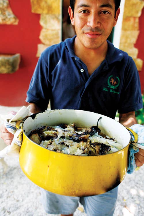 Marinated in a crimson achiote and citrus juice marinade and served with pickled onions, this chicken dish is eaten all over the Yucatan. It gets an additional layer of flavor from the banana leaves that line the inside of the pot, but should you opt not to use them, the result will still be delicious.