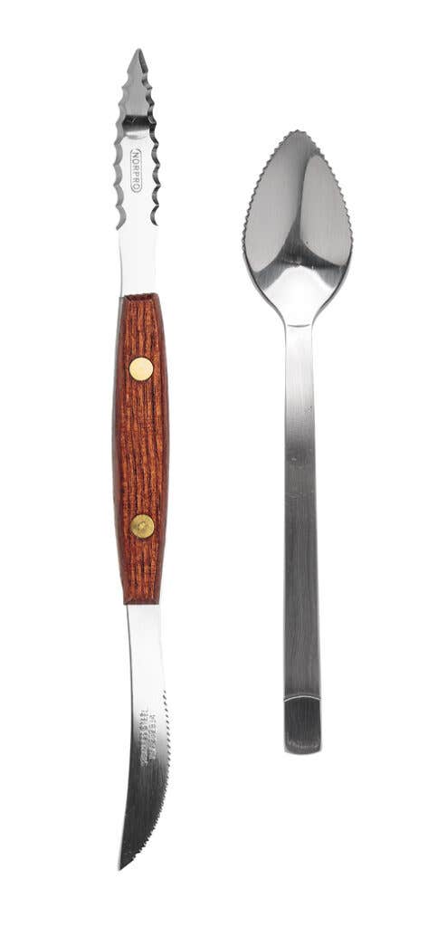 When we're faced with a fresh, blushing half grapefruit, the double-sided Norpro Squirtless Grapefruit Knife ($7; amazon.com) is the first tool we reach for. The twin serrated blade at one end slices on either side of the tough membrane, separating it from each segment of flesh. The curved, toothed prong at the other end reaches beneath the segments, cutting and lifting them free of the pith. When it's time to eat, the Trudeau Grapefruit Spoon ($13 for a five-piece set; amazon.com) has a tapered serrated edge that dislodges and scoops up each bite. It's ideal for scraping up bits of fruit the knife might have missed, and its bowl, of course, spoons up the juice.