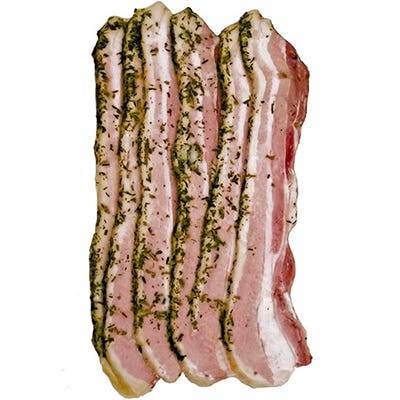 The first thing I noticed as I opened the package was the thick cut of the cured pork, which is hard to find in a pre-packaged variety. Still, I was skeptical of the green, herbal coating on each slice—does a food product as rich as bacon really need spices or herbs? But as the slices sizzled, the sweet, tangy scent of rosemary and thyme began to bloom, making my mouth water. I flipped the hearty strips and pulled off a crispy edge. The fresh flavor of the herb crust gave way to the salty smokiness of the bacon. It was utterly delicious.