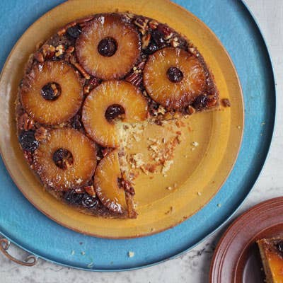 - Heat oven to 350°F. Heat 8 tbsp. butter in a small skillet over medium-low heat. Add brown sugar and cook, swirling often, until the sugar is melted and the mixture is bubbly, about 5 minutes. Immediately pour into a greased 9" cake pan and swirl to evenly coat the bottom. Arrange pecans, cherries, and pineapple on top of the brown sugar mixture.