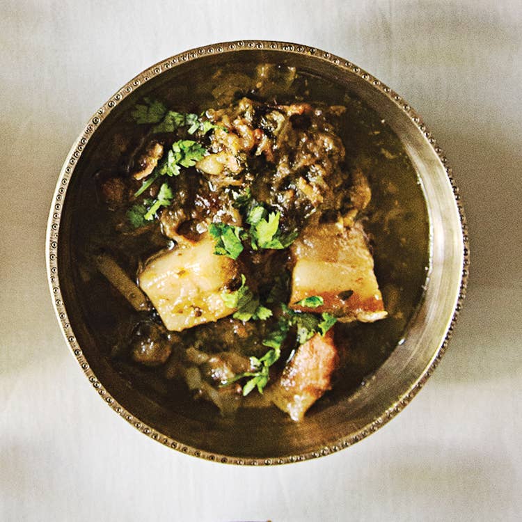 India's northeastern states are a world apart from the rest of the country. Connected to the subcontinent by a mere thread of land, their kinship with bordering Bhutan, China, and Myanmar is reflected in the cuisine. Cooks rely on ingredients like black sesame paste and salty fermented foods, and pork and bamboo feature prominently. One example is this braised pork belly from cookbook author Jyoti Das, inspired by an Assamese tribal dish. Spiced with Thai chiles, garlic, ginger, and turmeric, it first appeared in our August/September 2014 special India issue with Jyoti Das' story Eating in Tea Country.