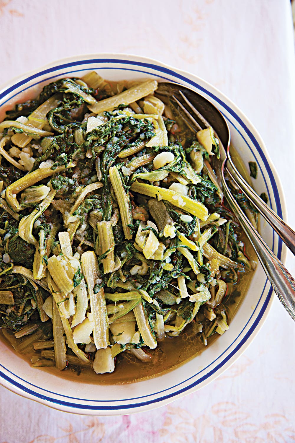 - 1 lb. Swiss chard, tough stems removed, tender stems and leaves torn into 2″ pieces