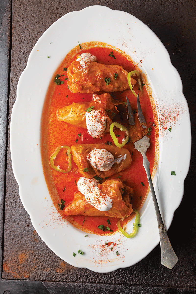 A thick cornmeal and smoked ham filling is rolled in blanched cabbage leaves and braised in a paprika-spiked tomato sauce in a comforting dish from Hungarian home cook Edit Szabo Gezane. This recipe first appeared in our October 2013 issue with the article Rhapsody in Red.