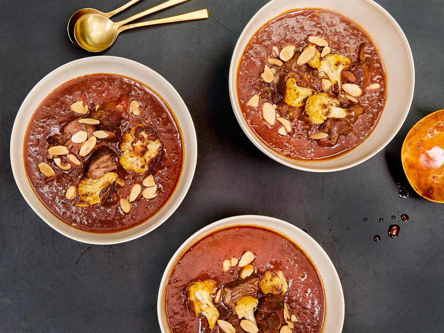 This warming lamb stew with Tunisian red chile paste makes use of the whole head of cauliflower: The flavorful stems are minced and sauteed along with the mirepoix, while the florets—broiled and added at the end—lend crunch and body. Harissa adds a kick of heat and acidity to everything from soups to pastas to roasted vegetables, but its garlicky base pairs particularly well with fatty lamb.