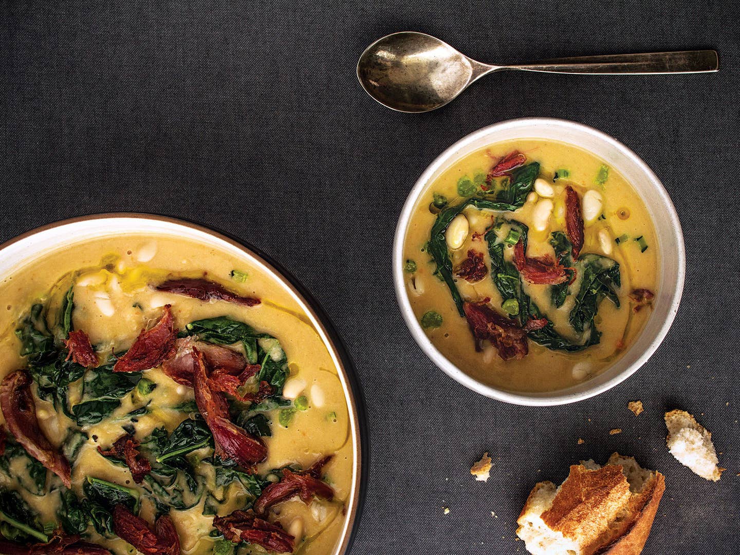 After flavoring the beans for this creamy winter soup from Oceania Cruises senior chef instructor Kellie Evans and Vice culinary director Farideh Sadeghin, smoked ham hock is shredded and pan-fried, intensifying its flavor. Lacinato kale, or cavolo nero, is more tender than the curly variety, and cooks down quickly to add bright acidity to the beans.