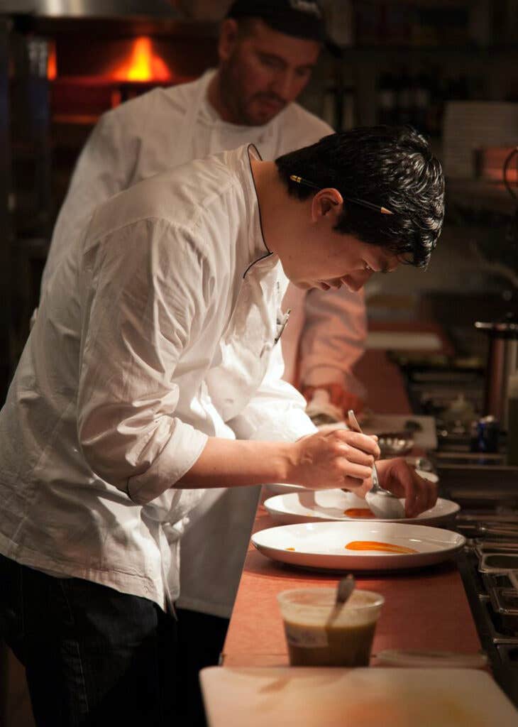Brown also worked the contrasts in the off-menu pasta course: caramelle, small rectangular pasta sheets twisted at the ends to resemble candy wrappers, had a stalwart al dente bite that gave structure to the out-of-bounds richness of their filling, a funky, gooey blend of Gorgonzola, ricotta, marscarpone, and cream. For the white truffle butter that sauced the pasta, the chef cooks the pungent fungi in butter to soften them, and then whips them and freezes the whip so that he can dress plates in that luxe flavor far beyond the truffle season. It’s a great tip for a lucky home cook like me, who happened to come by a few choice truffles this year and had a bit leftover after shaving them over risotto.