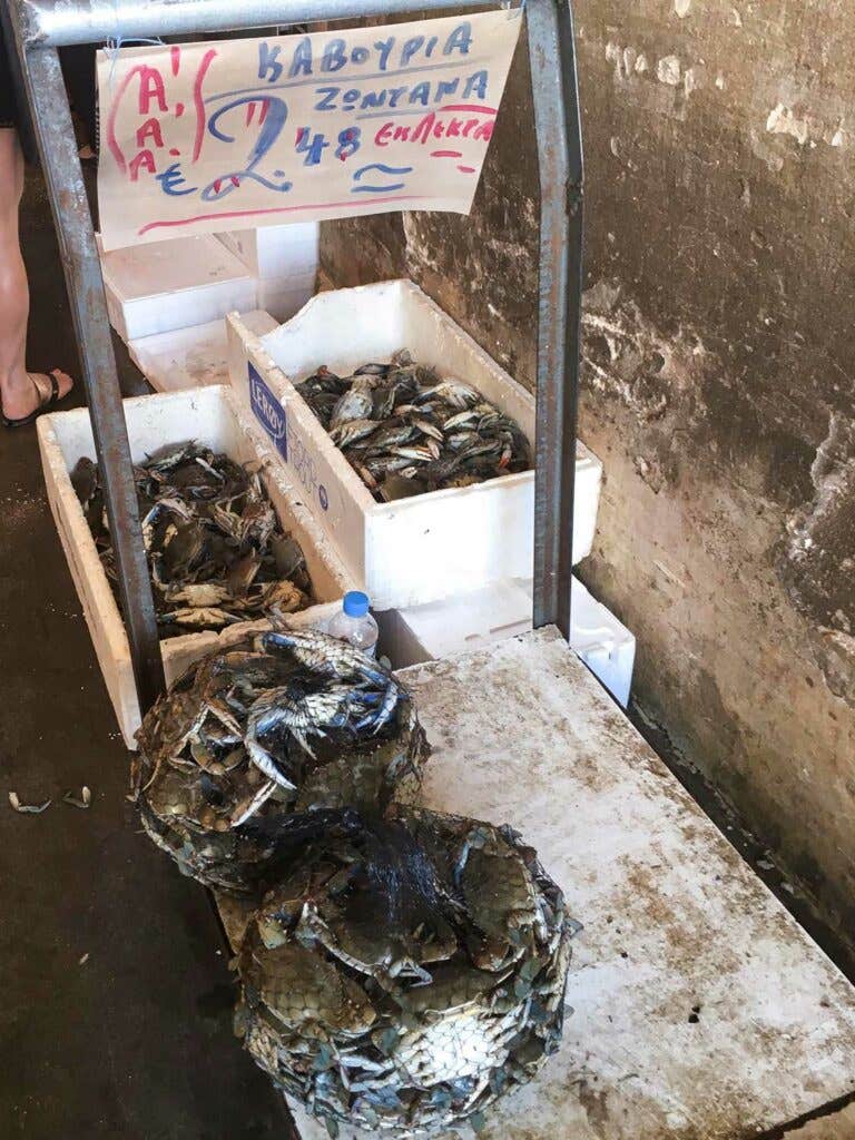 Then there are the spices. Bag after bag of oregano, lavender, dried basil, thyme, peppermint, and mixes with names like “Salad mix” were stacked high in storefront shelves. As I moved past that, under the glass ceiling, I started to get to the meats and fish. Whole animals hang upside down, all parts present except for an epidermis. In the fish aisle, glassy eyed tuna and anchovies stared at me as I walked past. I even spotted an aisle of the market that appeared to be home to several mesh bags of giant crabs. I barely resisted scoring a few bags of gorgeous anchovies—my favorite thing to fry up and eat one after another, like french fries.