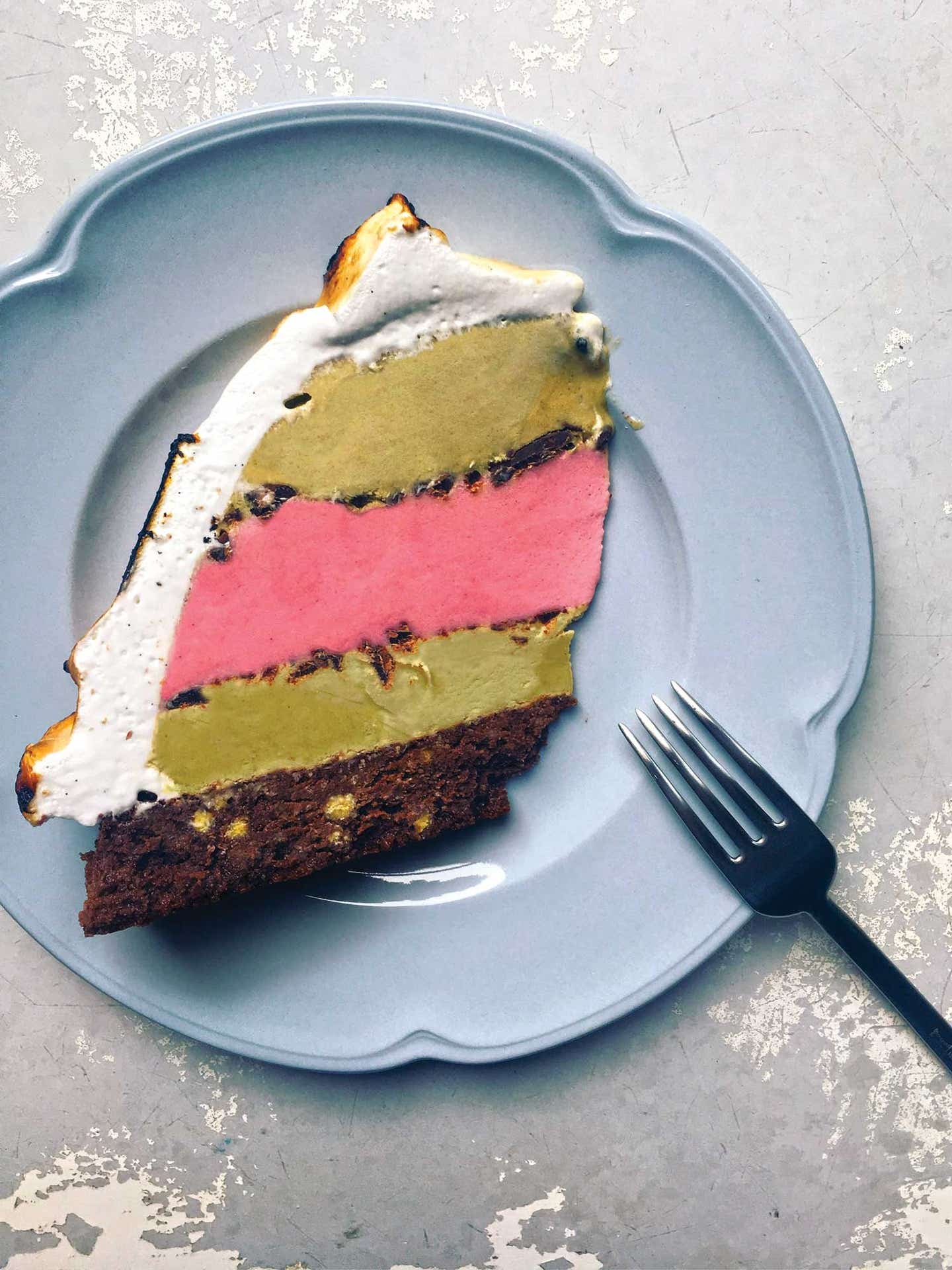 With three colorful layers of ice cream domed atop a fudgy, flourless chocolate cake, our version of this retro dessert is a project perfect for celebrations. (Especially if you make your own ice cream: We used our homemade Pistachio Gelato and Raspberry Ice Cream.) You can vary the assembly as you like—layering the ice cream in any pattern or thickness, or flambéing the meringue topping or not. But whatever you choose, give yourself a day or two in advance to prepare.