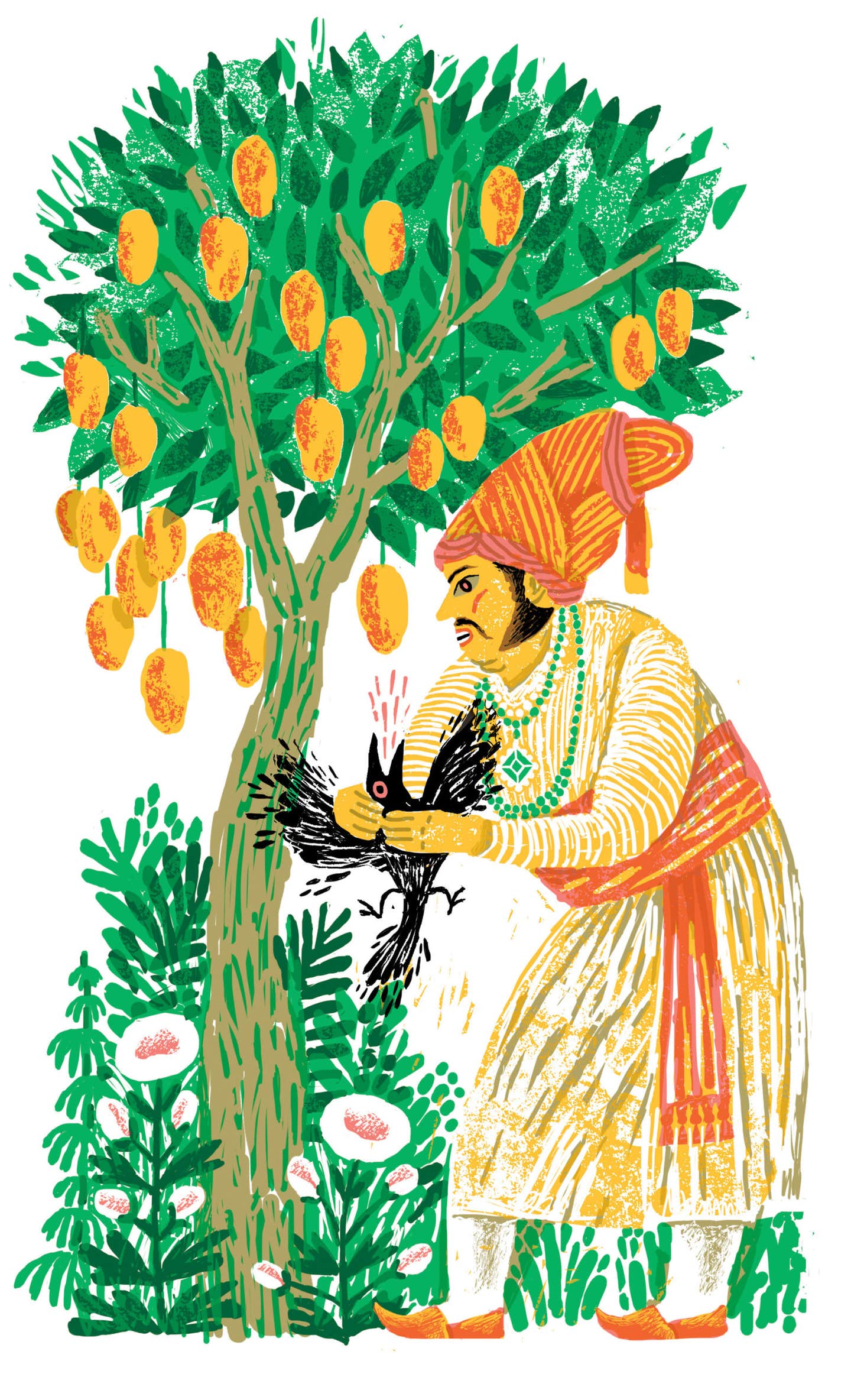 Brought down from the heavens by a magpie, the first mango seed was offered to an ancient king with the promise that its fruit would grant him—and all who ate it—eternal life. As the Kannada tale goes, the king, skeptical of the magpie’s gift, planted the seed. Once the tree grew and the fruit had ripened, he ordered a peasant man to try it. But, by some strange accident, the mango had been poisoned when an eagle with a venomous snake in its talons had passed over the tree—the peasant man died instantly. Aghast, the king strangled the magpie for lying, and mangoes were decreed deadly. Years later, an old woman, desperate to escape her family’s abuse, planned to end her life with a mango. But as she ate the fruit, she became young and beautiful again, and the mango’s life-affirming powers were revealed to the world. Wracked with guilt for killing the magpie, the king—rather than partake of the tree—took his own life.