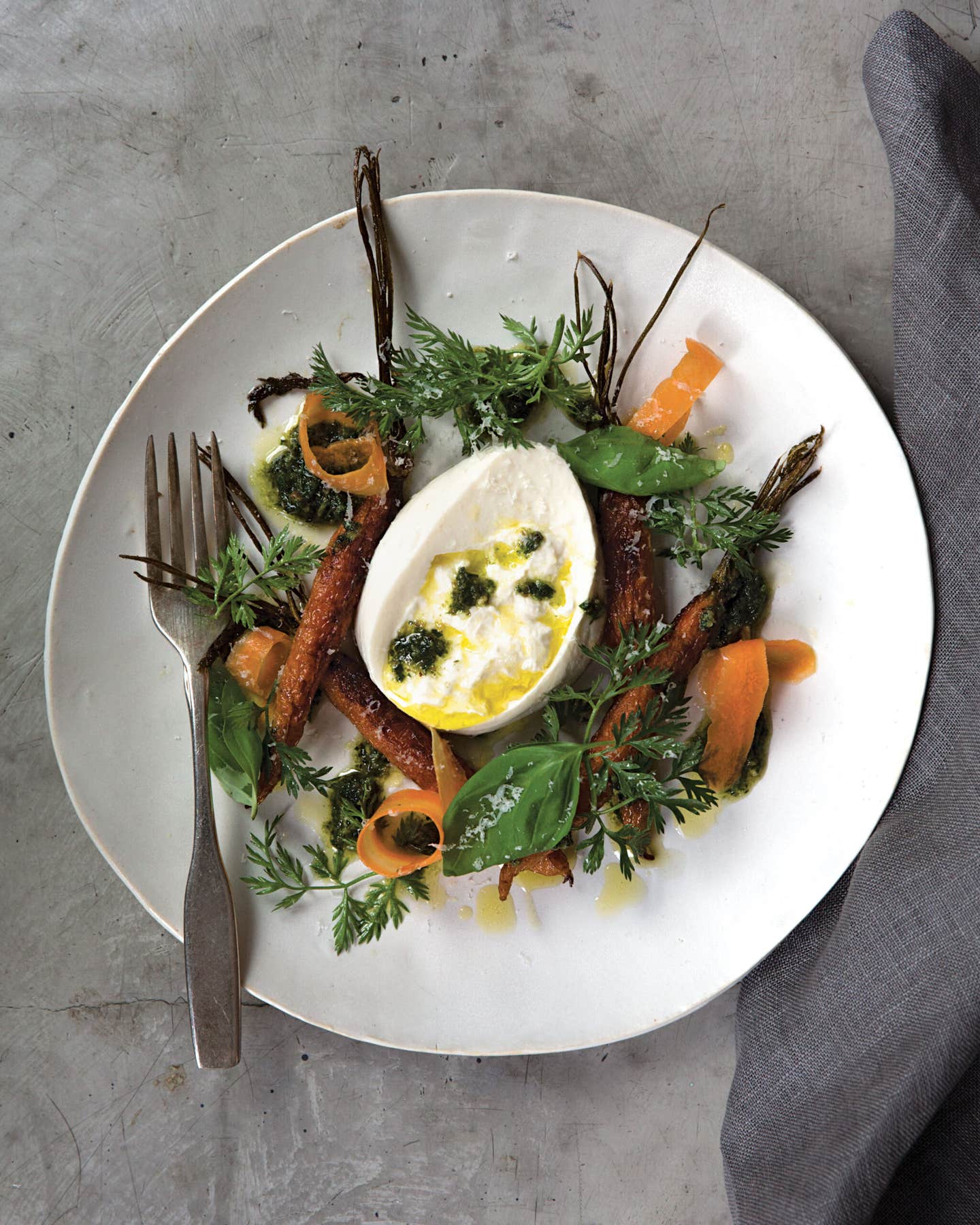 "I've become known for doing nose-to-tail pig cooking, so this is kind of top-to-tail vegetable cooking," says New York City chef April Bloomfield of her pan-roasted carrots with carrot-top pesto, shaved carrot salad, and creamy burrata. Get the recipe >