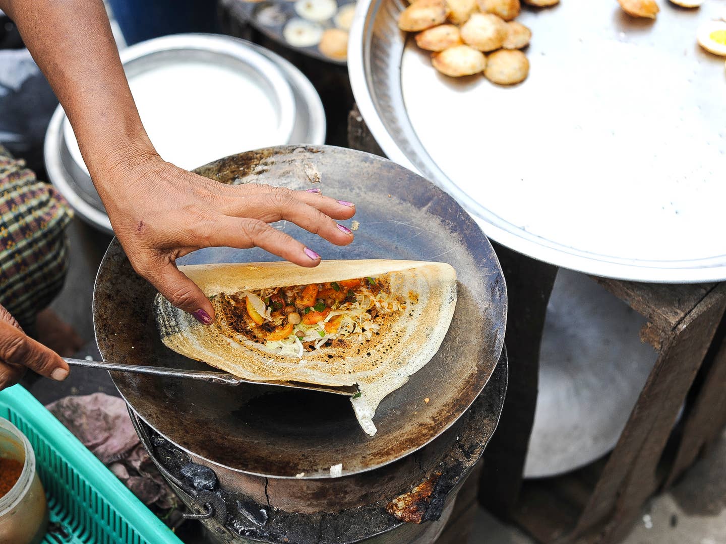 Dosas represent the Indian contingent of Burmese cuisine. This southern Indian pancake is made with a batter of fermented ground lentils and rice, and you can find them on many street corners in downtown Yangon. A thin layer of batter is spread quickly inside a concave metal pot over hot coals, and the back of a ladle is used in a circular motion to ensure the dosa is evenly cooked. The vendor then adds chopped tomatoes, chickpeas, less than a dollar, and you can walk away with a crispy snack any time of day.